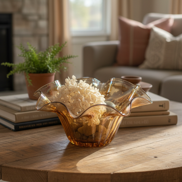Add a touch of vintage charm to your home with this stunning Golden Glow Glass Bowl. Its wavy edges and iridescent amber finish make it a perfect centerpiece or decorative accent for any space.